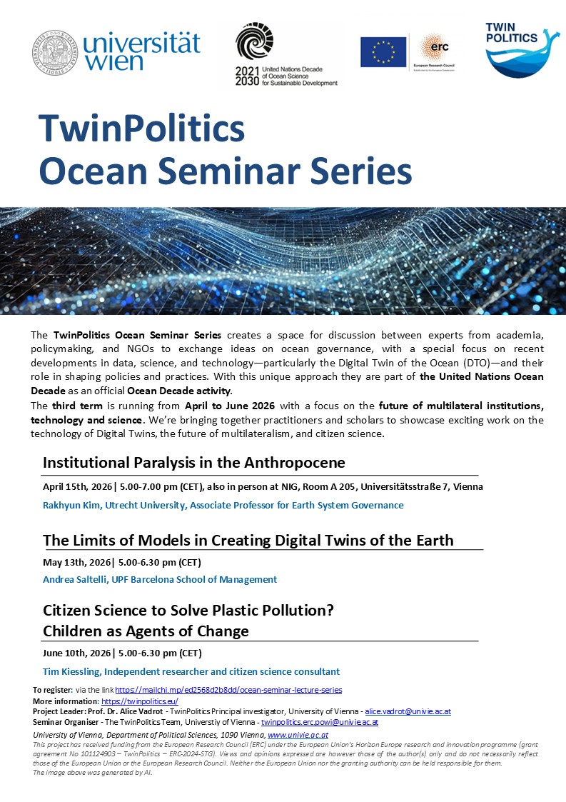 The TwinPolitics Ocean Seminar Series creates a space for discussion between experts from academia, policymaking, and NGOs to exchange ideas on ocean governance. The focus is on recent developments in data, science, and technology—particularly the Digital Twin of the Ocean (DTO)—and its role in shaping policies and practices.